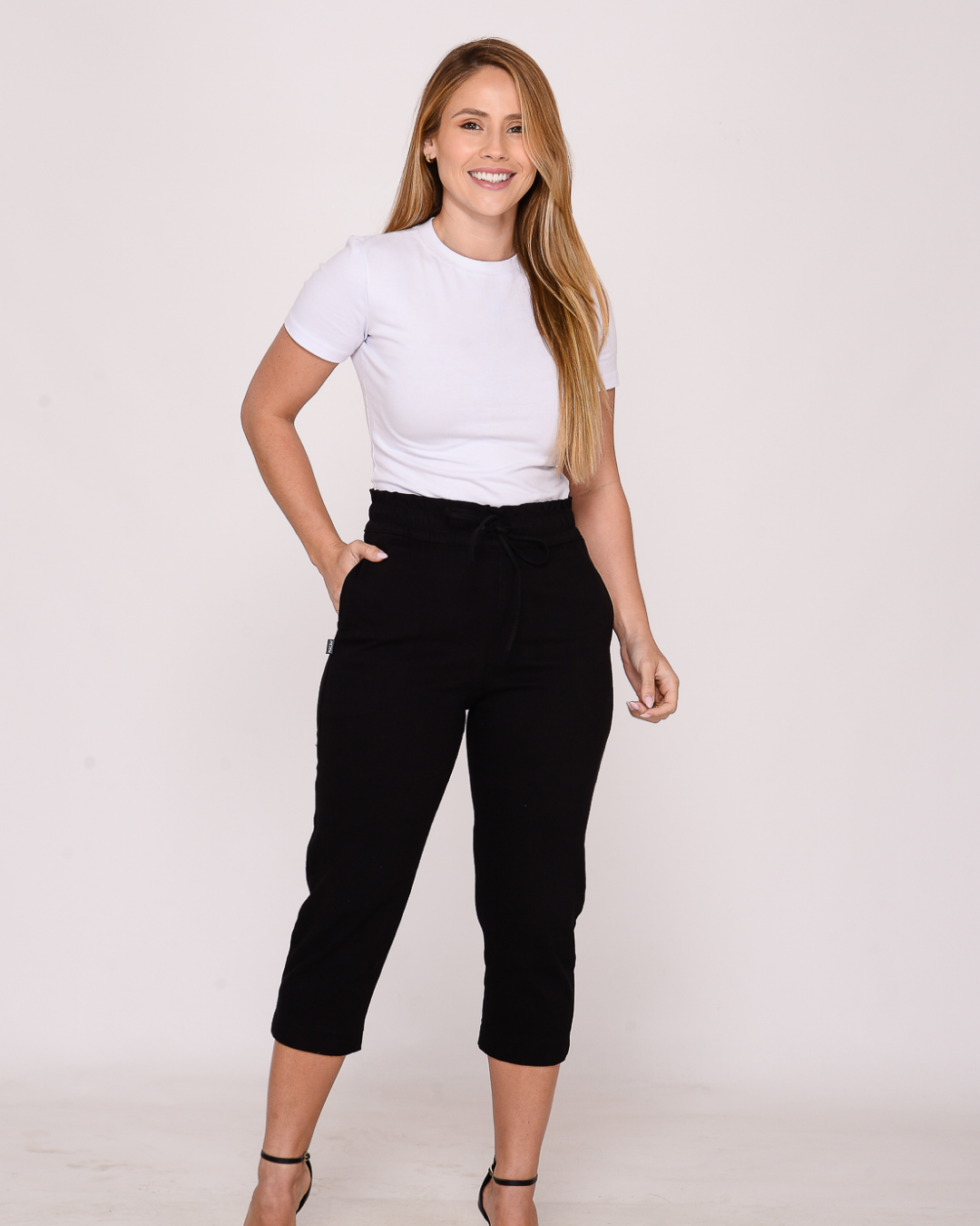 A Calça Capri Feminina Preta é a escolha ideal para quem busca um visual moderno, prático e sofisticado. Com comprimento intermediário, ela proporciona leveza e conforto, sendo perfeita para dias mais quentes ou produções versáteis.